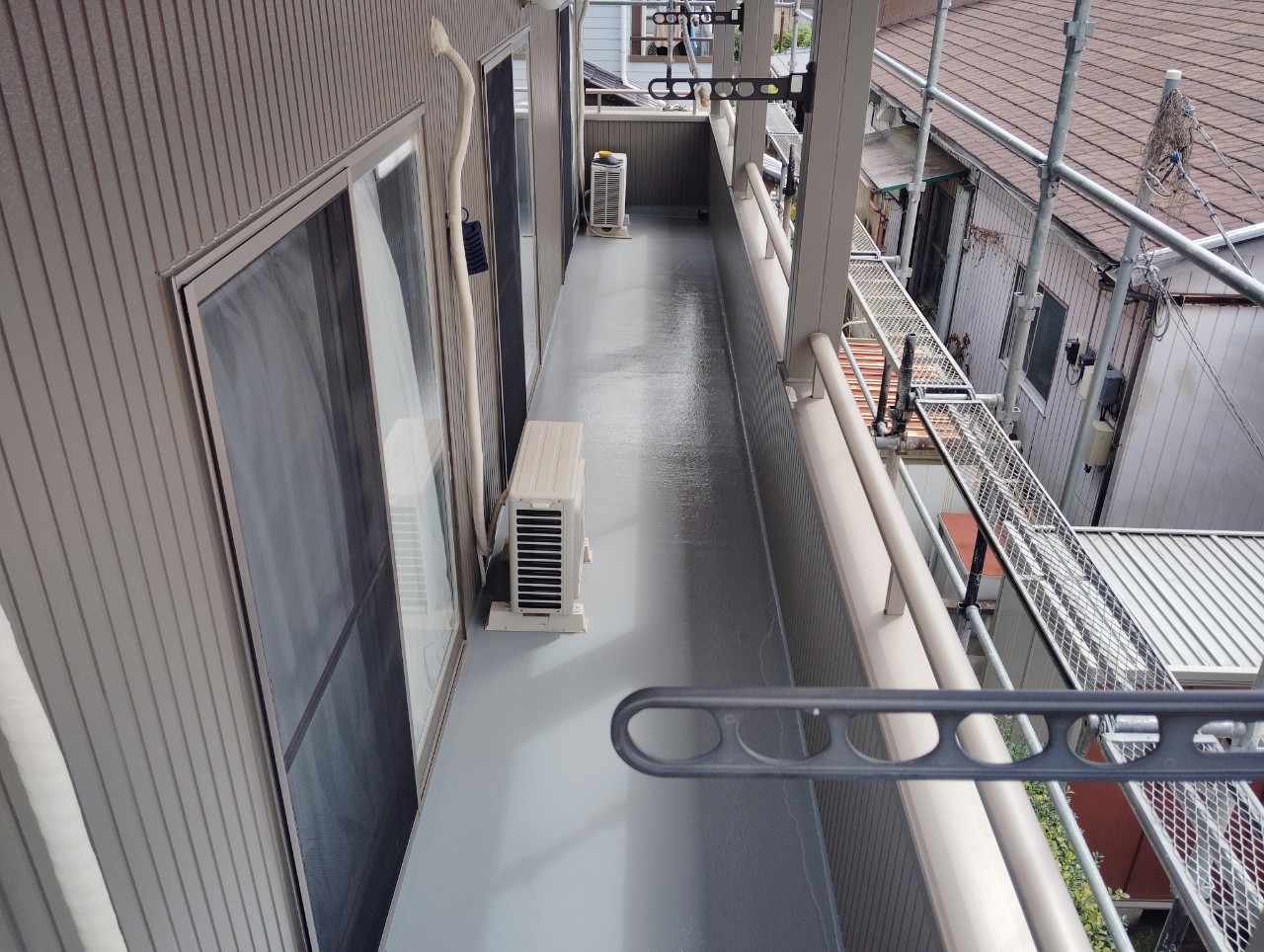 下地の形が複雑でも一体膜にできるため漏れにくく、短期間で歩行可能な状態に戻せるメリットがあります。一方で樹脂の硬化や研磨、トップコートのタイミングなど施工管理が求められるため、技能のある職人の手配が仕上がりを左右します。